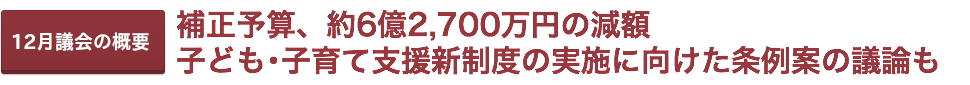 12月定例議会(12月15日〜12月24日)では、人件費等の執行見込み減に伴い、一般会計・特別会計・企業会計の合計で約6億2,700万円減額する補正予算が提案・可決されました。
