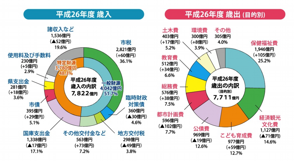 歳出総額は、前年度に比べ43億円(6%)の増となりました。目的別にみると、保健福祉費が105億円の増、こども育成費が59億円の増となった一方で、都市計画費や経済観光文化費が減少しているところが特徴です。