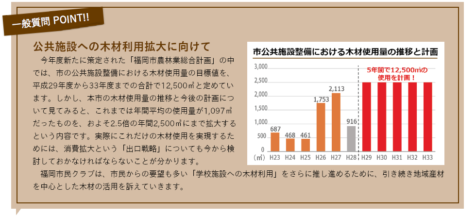 福岡市は、市域面積のおよそ1/3を森林が占めるという、大都市の中では珍しい「森林都市」ですが、その管理はなかなか行き届いていないのが現状です。森を守っていくためには、木を「植える」「育てる」「使う」というサイクルをしっかりと循環させることが必要。そのためには「木材を使う」ことが本市にとって重要であることから、今後の木材使用量の拡大に向けた具体的な提案を行ないました。