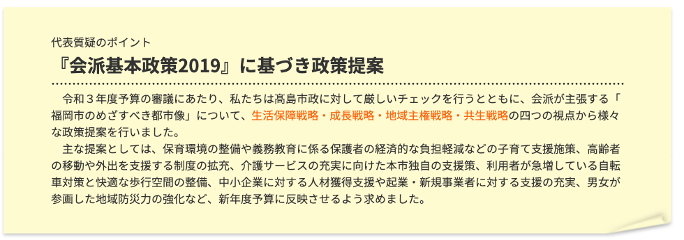 令和3年度の予算審議にあたり、会派が主張する「福岡市のめざすべき都市像」について、①生活保障(一人ひとりの命と幸せを大切にする社会)、②成長(人と技術の結びつきが新たな価値を生み出す創造都市)、③地域主権(市民が自ら発言し議論し決定する仕組みづくり)、④共生(一人ひとりの生命と尊厳を守り誰もが安心できる共生社会)という4つの視点から様々な政策提案を行ないました。