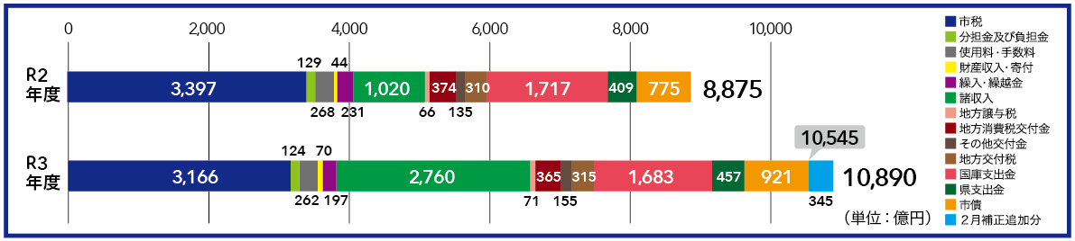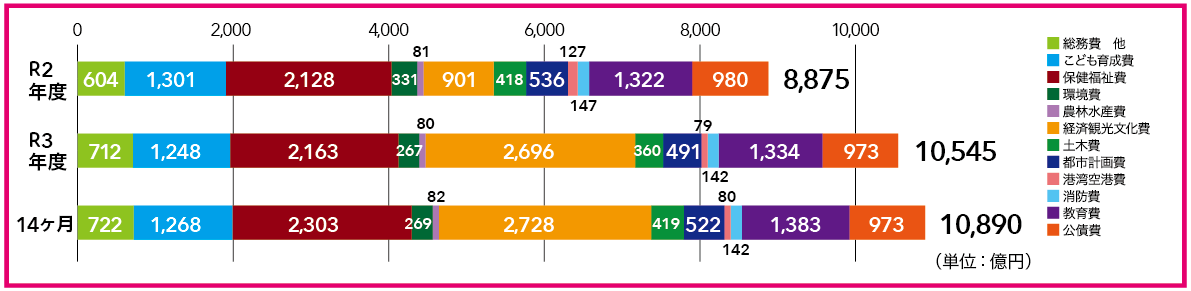 令和3年度予算については、国の補正予算と連動した、令和2年度2月補正予算と一体的に編成することにより、コロナ禍においても真に必要な施策を積極的に推進する予算編成を実施しました。令和2年度の2月・3月の2カ月と令和3年度の12カ月を総じて「14カ月予算」と称しています。