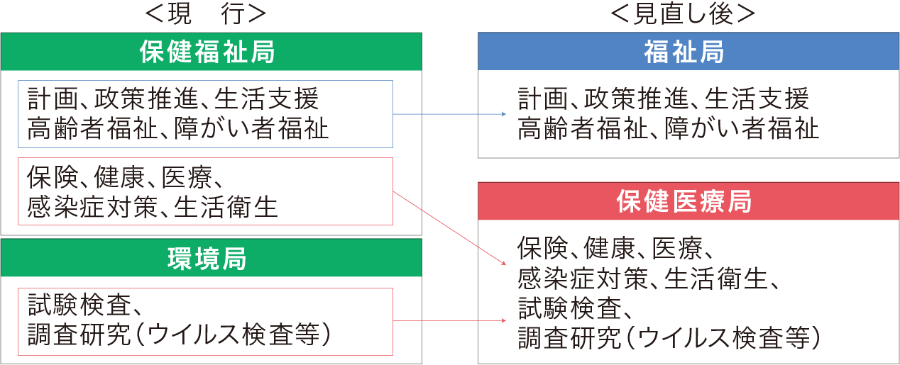 多様化する市民の福祉ニーズに対応した保健福祉施策の推進を図るとともに、新型コロナウイルス感染症等に係る取組みを充実強化するため、行政組織を再編する必要があったもの(見直し内容は図の通り)。
